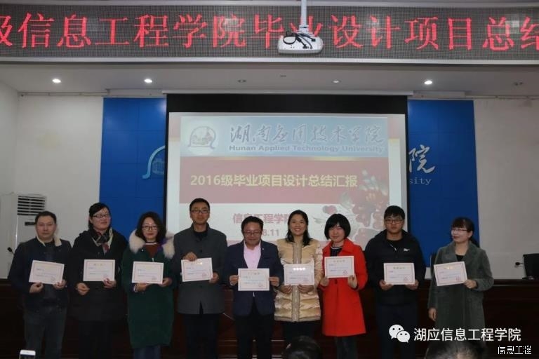 下面是易晓鹏老师代表优秀老师发言,他介绍了在毕业设计中大家的集体工作。最后彭进香院长肯定了辅导员的努力,确保了各项活动的开展,肯定了指导老师,在有如此大的论文压力的同时抽出休息时间辅导同学,肯定了同学们的努力和坚持。