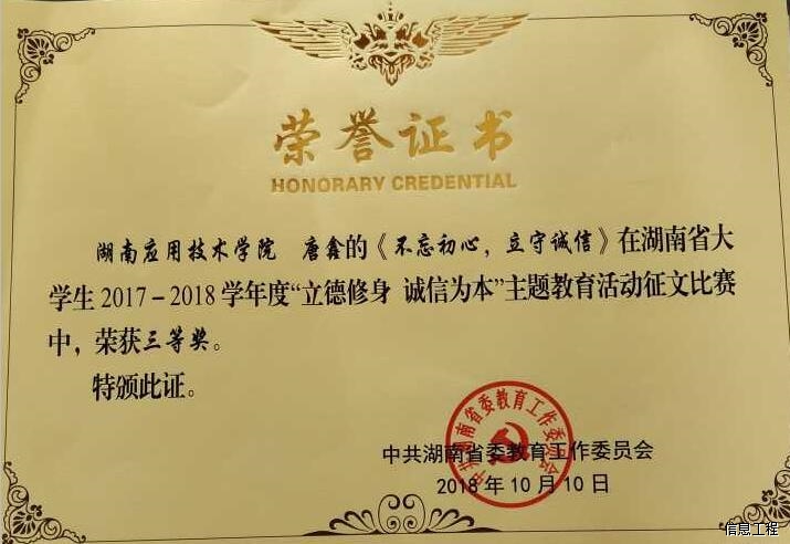 我院唐鑫同学,在参加“立德修身,诚信为本”为主题的征文比赛中凭借《不忘初心,立守诚信》在湖南省大学生2017- 2018学年度“立德修身诚信为本”主题教育活动征文比赛中,荣获三等奖。