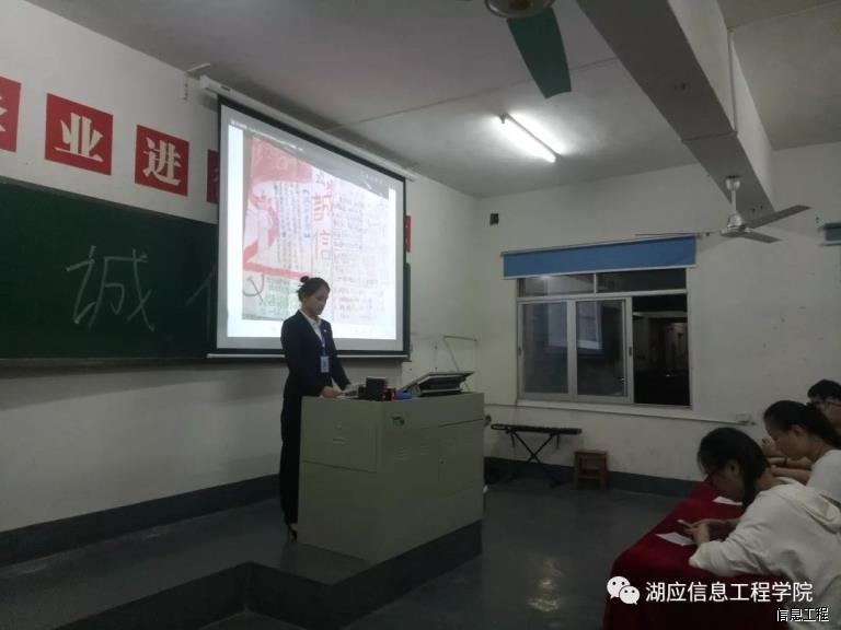 5月28日下午6点30分教学楼402举行了诚信演讲比赛,本次比赛面向信息工程学院全体学生,并且担任此次活动的评委有:党员管理中心纪检部长李万成,党员管理中心办公室主任陈雨露,新闻部部长唐鑫,团总支副书记王凯旋,团总支组织部部长杜特。