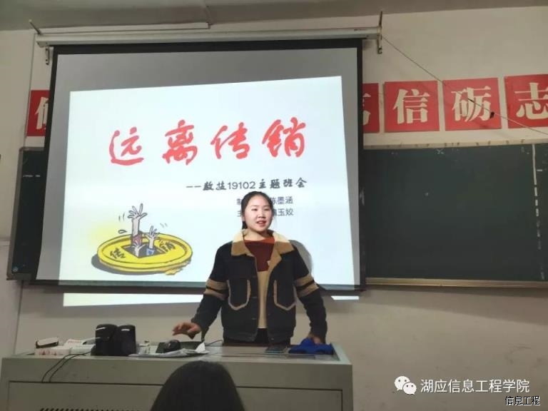 继打击传销宣传月启动仪式后,为了更好的预防同学们陷入传销的无尽死循环当中,数技19102班的团支书魏玉娇同学于2019年11月20日在本班开展了一场"远离传销"的主题班会。