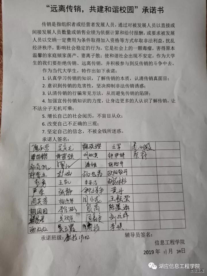 最后,在我们认识并学会预防传销之后,班会开始第三环节,庄严地宣读承诺书,在承诺书上庄严地签上自己的名字,以后的我们要自觉预防传销,投身并践行到抵制传销的主流队伍当中去,为实现中华名族的伟大复兴而贡献一份微薄的力量。