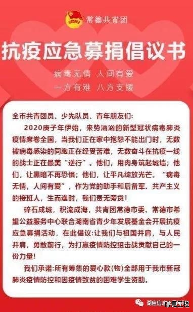 应常德团市委抗疫应急募捐倡议书内容,作为党的助手和后备军,让我们与祖国并肩,与人民并肩,为大学母校生源地献出一份情,为打赢此次疫情防控狙击战贡献自己的一份力量!此次捐款请同学们将善款统一交到团支书处,由各班团支书统计捐款人员班级、姓名、捐款数额,于2月22日之前上交信息工程学院团总支。本次活动受学院监督,各班级捐款总数目,以及各班级捐款人员名单,将通过官方途径公布。