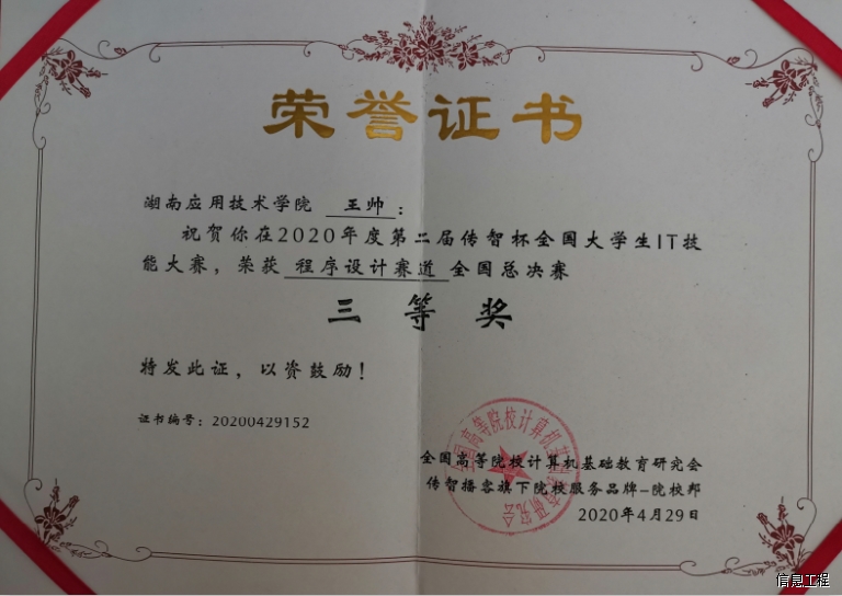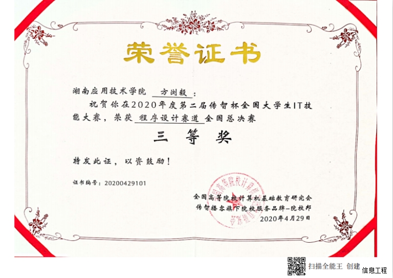 由全国高等院校计算机基础教育研究会数据科学专委会主办,传智播客旗下院校服务品牌——院校邦承办,并由CODING、绿色软件联盟、百度、华为云、声智科技等技术企业共同协办的第二届“传智杯”全国大学生IT技能大赛圆满结束。该比赛坚持“以赛促学、以赛促教、以赛促就业”的办赛宗旨,因此我院积极组织学生参加比赛,为增强大学生就业竞争力,提升在校大学生的IT应用和实践综合能力,帮助提升大家编程算法思维及程序设计能力,使其进一步具备企业人才需求。大家踊跃报名,经过激烈角逐,方浏毅、郭鹏程、王帅成功入围决赛并取得优异成绩。