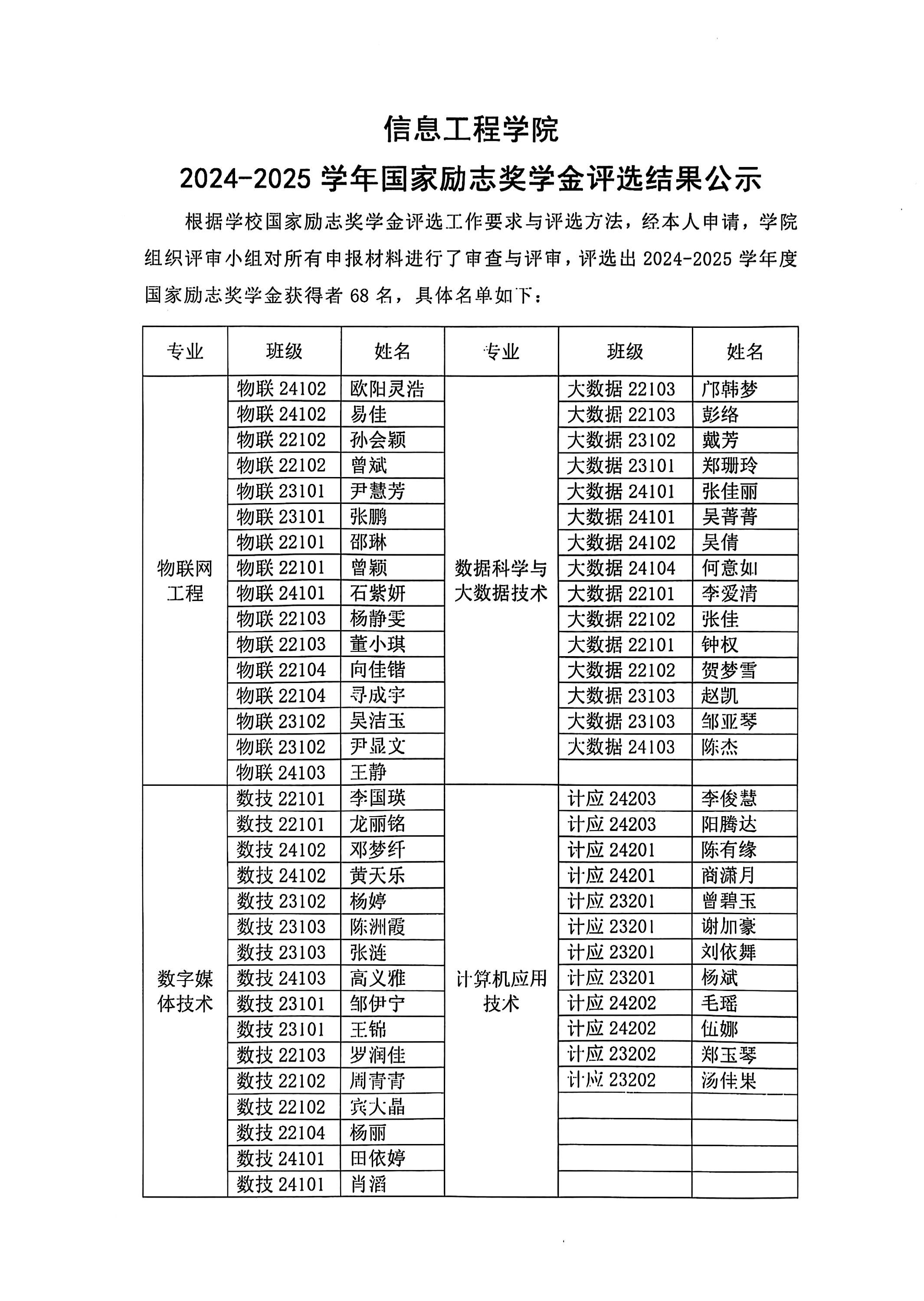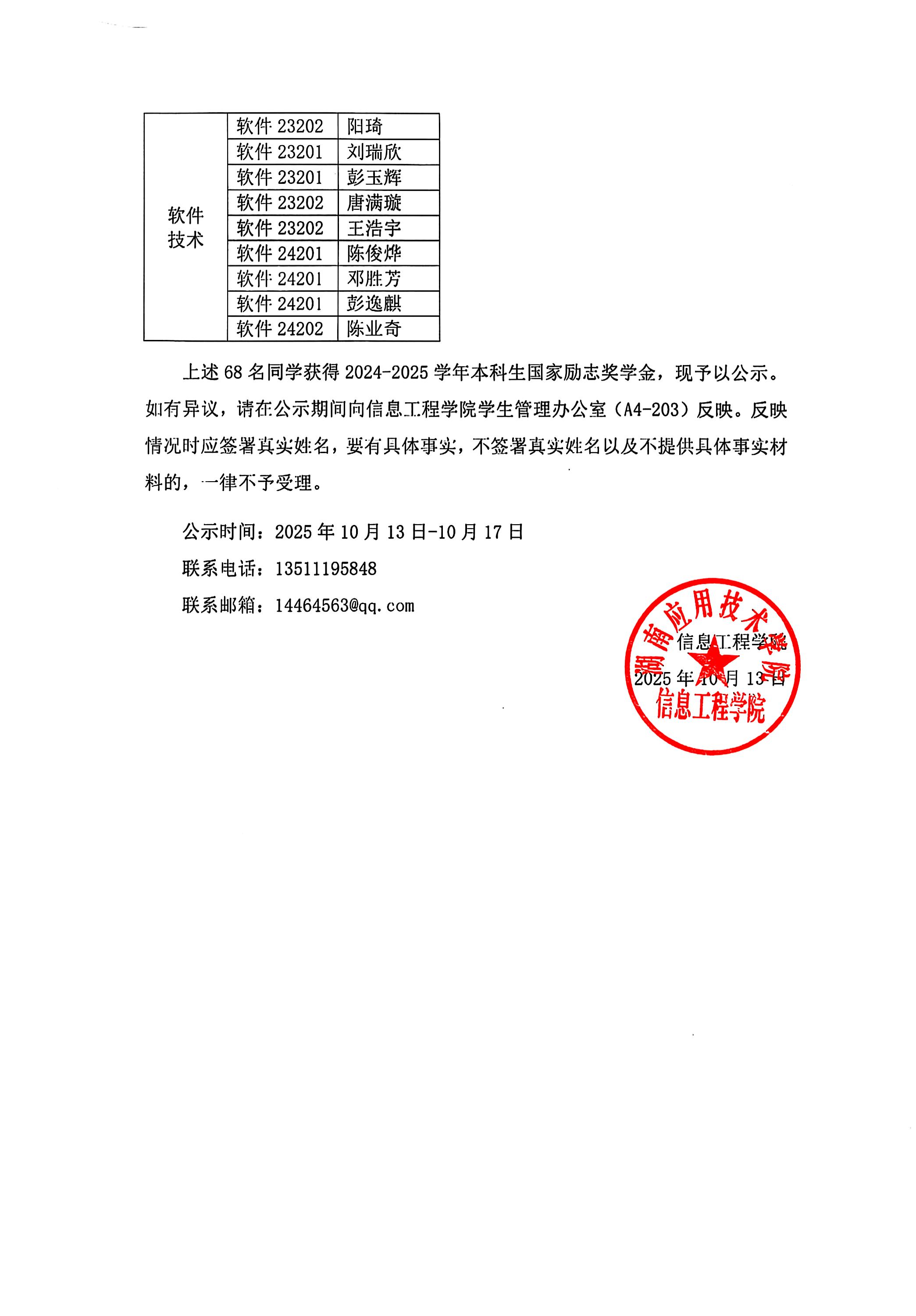 2024-2025学年信息工程学院国家奖学金评选结果公示