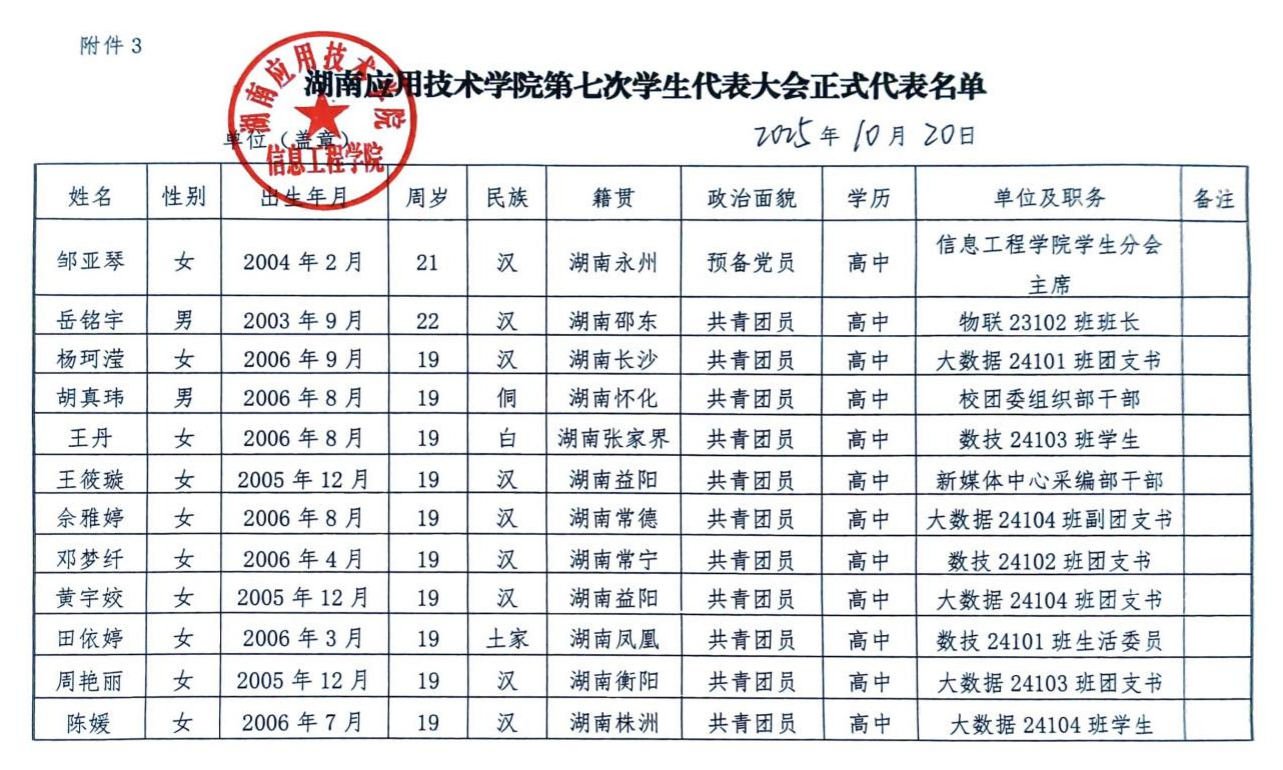 湖南应用技术学院第七次学生代表大会代表名单为: