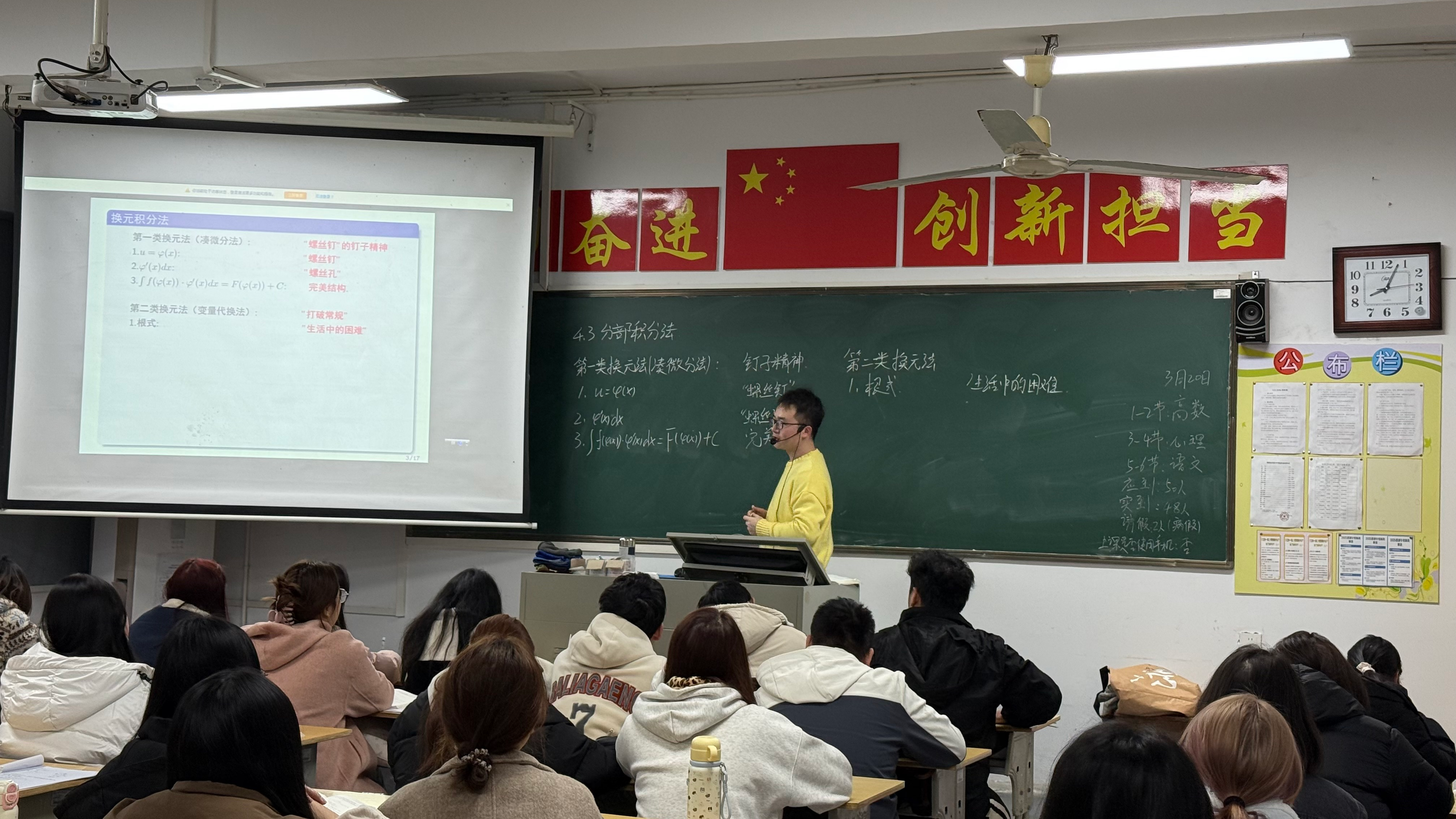 信息工程学院蒋志力老师把雷锋精神融入高等数学课堂教学。课堂中,蒋老师以第一类换元法讲解雷锋“螺丝钉”精神的精准与服务意识,结合第二类换元法引导学生学习雷锋迎难而上的智慧,学会从根源解决问题,让学生在掌握高数知识的同时,将雷锋精神深植心中。