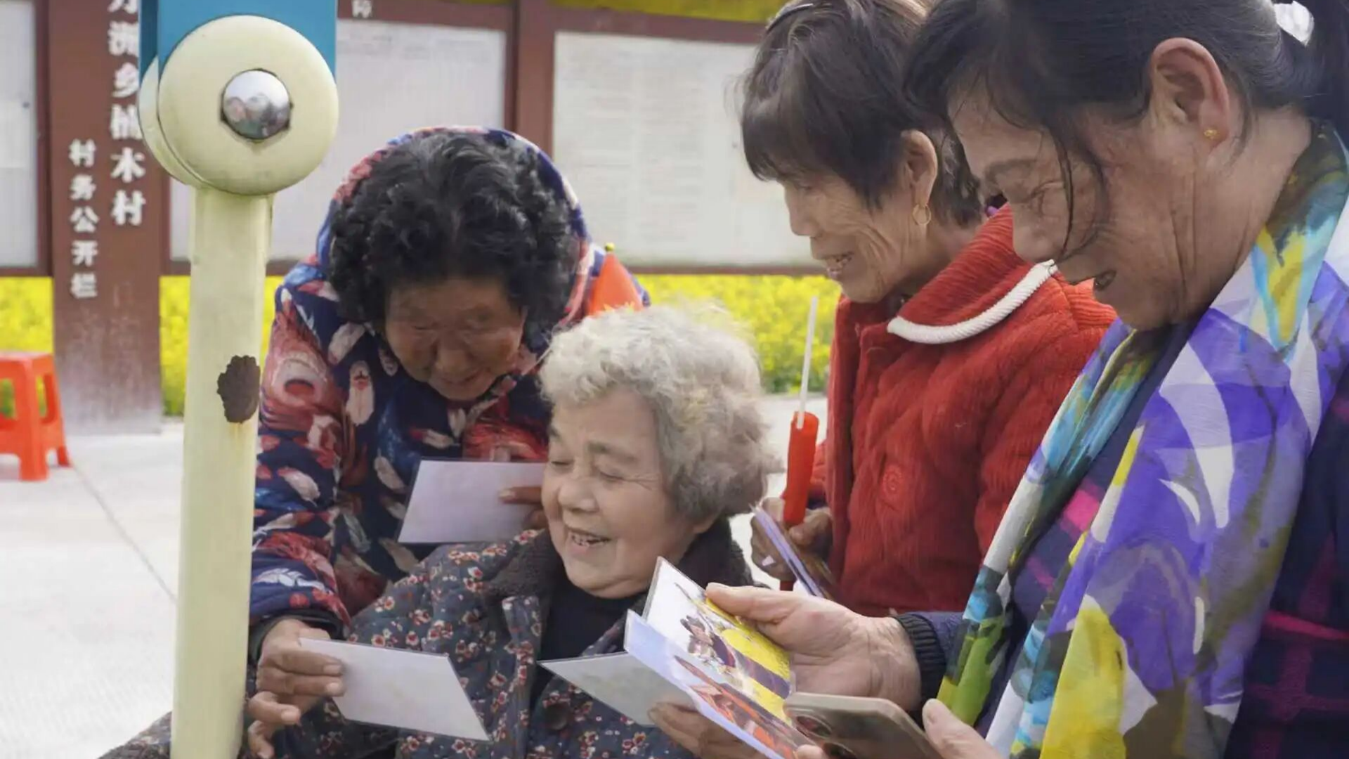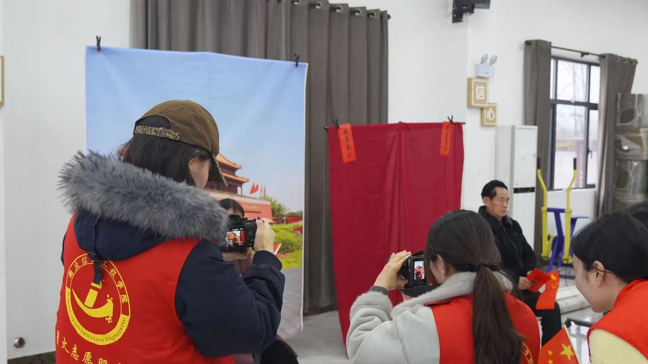 活动期间,志愿者们每日下午准时抵达现场,认真布置拍摄区、等候区与打印区,精心准备国旗、福字、对联等喜庆道具,搭建天安门主题背景布与红色背景布,同时依托楠木村清新秀丽的油菜花与桃园景致,营造出庄重又温馨的拍摄氛围。大家有序引导陆续前来的老人登记等候,全程细致周到,让活动有条不紊地开展。