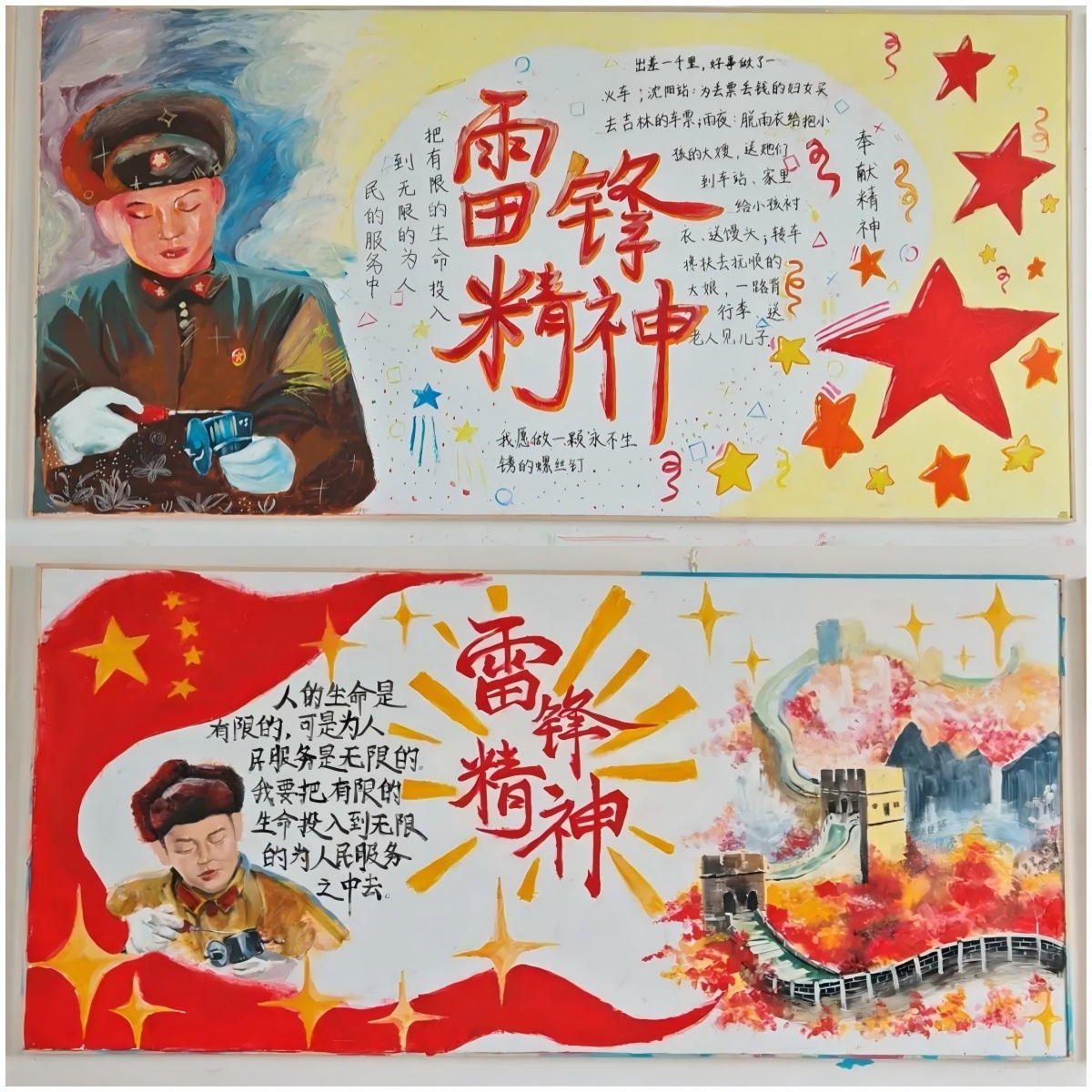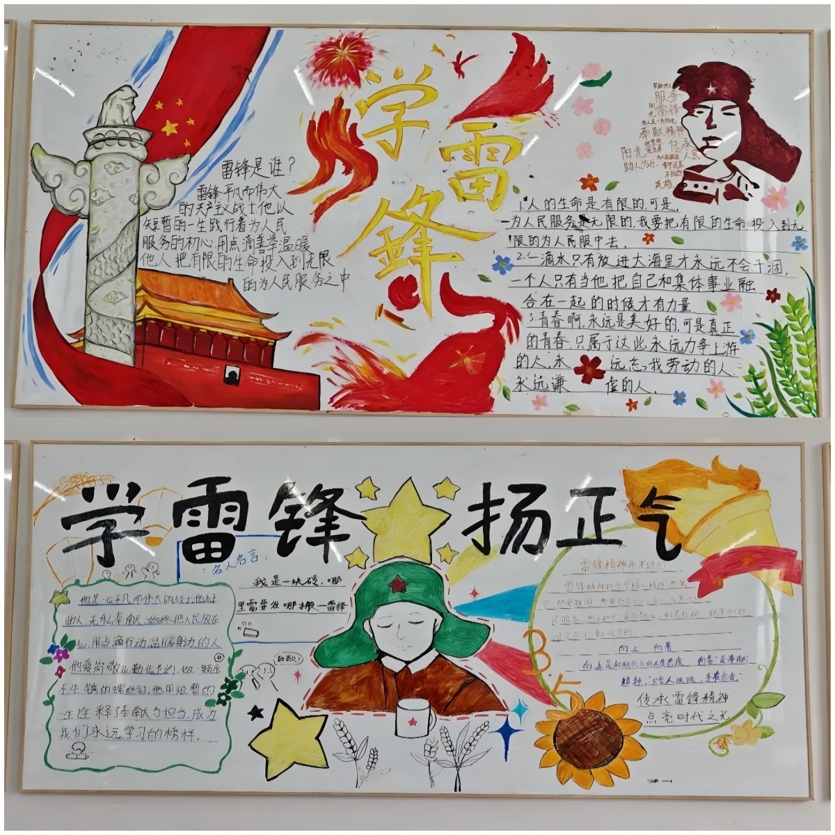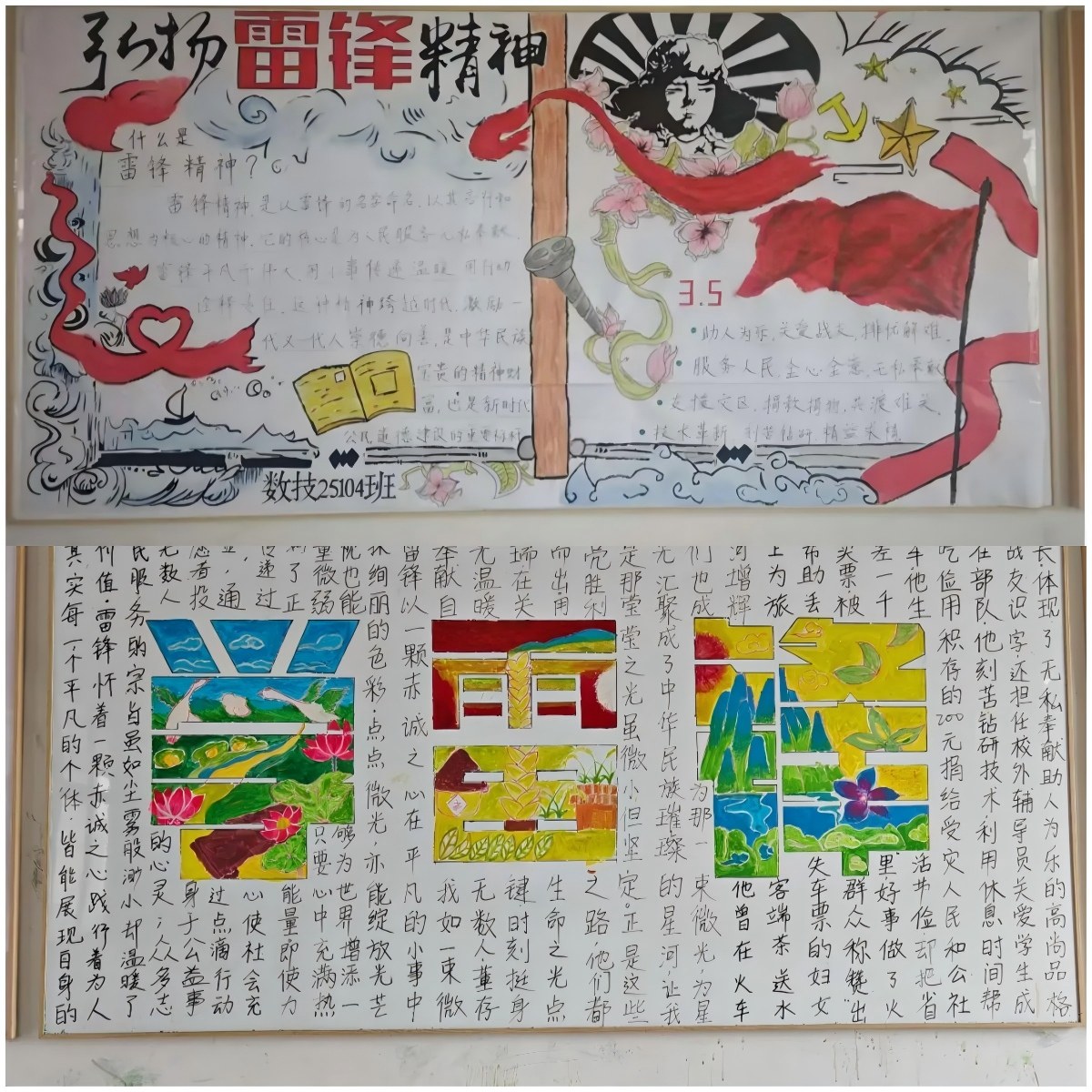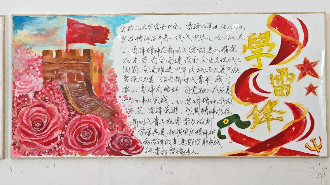 创作期间,各班紧扣“学雷锋”主题,巧妙融合雷锋事迹、志愿服务场景等元素。有的班级以手绘雷锋形象致敬榜样,用暖色调传递奉献温度;有的以漫画形式定格校园里的暖心瞬间,让“雷锋就在身边”的主题更加可感可触。鲜明的色彩搭配、流畅的绘画线条与工整的文字书写相得益彰,每一块板报都成为雷锋精神的生动注脚。