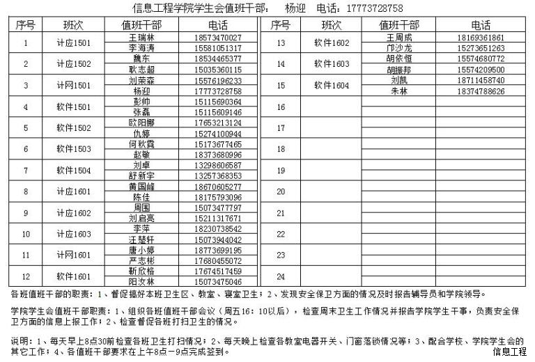 信息工程学院第12周学生干部值班安排表